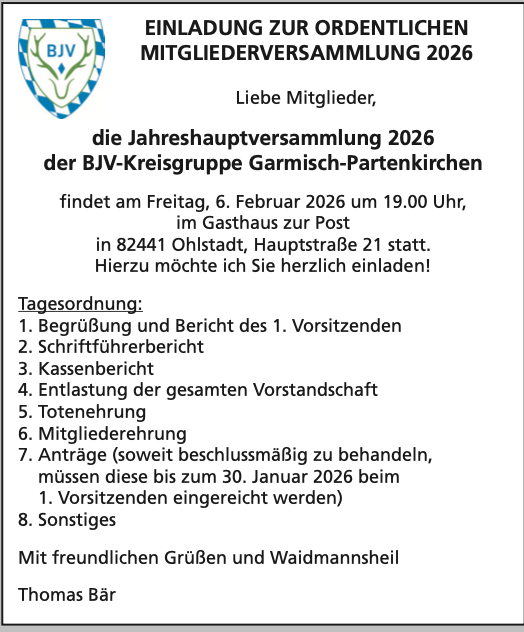 Anträge, die beschlussmäßig behandelt werden sollen, müssen bis spätestens 30. Januar 2026 beim 1. Vorsitzenden eingereicht werden.